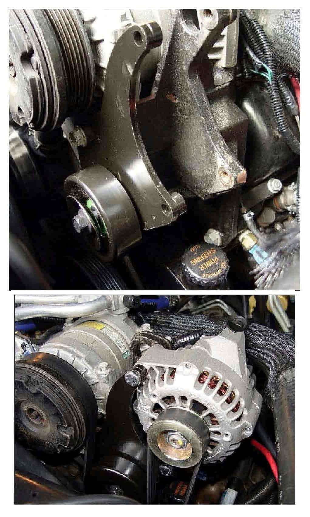 Dual alternator plate for GM V-8 and V-6 engines with this drivers side air conditioner mount serpentine belt. Actual plate picture not shown.  Fits most 1999 to present. V-8 and V6  engines with the drivers side A/C pump mount.  This version is for the vans or units with a remote Power Steering mount tank  Check your engine to see if you have a steel engine lift ring similar as shown in the upper right (rear) of the picture except it will not have the two tapped holes as shown, but willhave a oval hole in a steel lift ring and is not cast.  PLATE ONLY -  (the black part in the front of the upper picture) you will need to source the idler pulley and other parts - a bone yard will do fine for the pulley and spare alternator often.  A CS-144 alternator will also fit with the same mounting holes.   GM wiring schematic diagram  and parts list is included - including recommended belt size.  No alternator mount hole spacers welded on - washers instead.